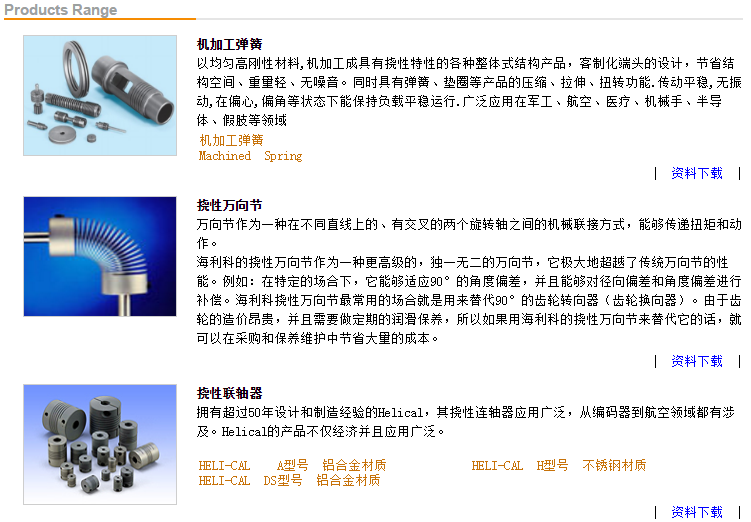 1958年George Sabadash運(yùn)用全新的理念發(fā)明了Helical撓性連軸器。在獲得良好的市場認(rèn)可后,George知道Helical撓性連軸器是非常符合市場需求的,并且George和他合作的伙伴們一次又一次的因市場的需求,增加和完善產(chǎn)品系列。到目前Helical聯(lián)軸器已有三大產(chǎn)品系列: Flexible Coupling,Machined Spring,U-joint。