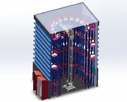 塔式立體倉(cāng)庫(kù),主要分為外部裝飾、外層倉(cāng)庫(kù)、內(nèi)層倉(cāng)庫(kù)以及三軸機(jī)器人。外層倉(cāng)庫(kù)固定,內(nèi)層倉(cāng)庫(kù)可在180度范圍內(nèi)旋轉(zhuǎn),中間采用三軸機(jī)器人代替?zhèn)鹘y(tǒng)堆垛機(jī),由旋轉(zhuǎn)、升降和貨叉三個(gè)驅(qū)動(dòng)機(jī)構(gòu)完成作業(yè)要求,末端配置夾緊工具。采用國(guó)際先進(jìn)伺服控制系統(tǒng)進(jìn)行控制實(shí)現(xiàn)機(jī)器人高精度運(yùn)行。最大負(fù)載可達(dá)40Kg,占地空間小、存儲(chǔ)效率高。支撐APP操作。適用于快遞物流行業(yè),可以減少投遞人員工作量,提高工作效率。